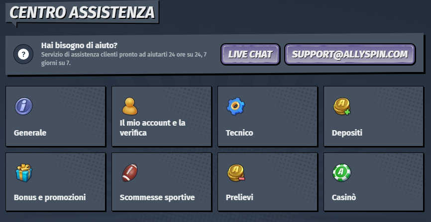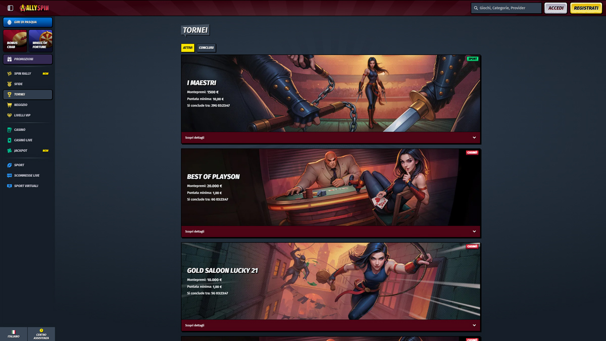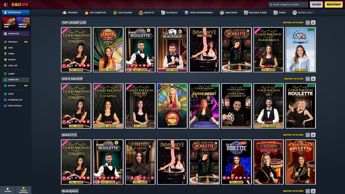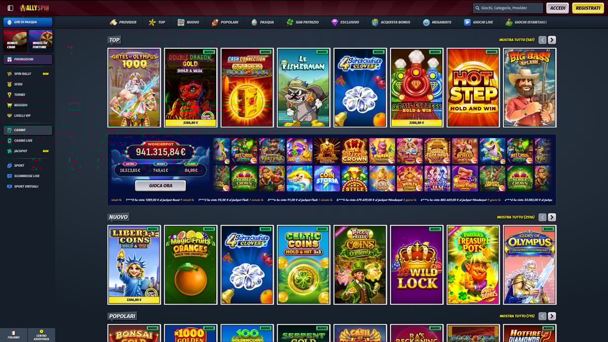 AllySpin Casino è entrato sul mercato nel 2024 sotto la società Stellar LTD con una chiara attenzione all'ampiezza, alla varietà e alla flessibilità. La piattaforma combina giochi da casinò, tavoli live e scommesse sportive in un unico account, con pieno supporto per i pagamenti in euro e l'utilizzo di criptovalute. L'interfaccia è strutturata e veloce, con una navigazione chiara e buone prestazioni sia su computer che su dispositivi mobili. Per l'Italia, la configurazione è semplice, con accesso diretto, bassi limiti di ingresso e una struttura bonus completa legata al gioco del casinò e alle scommesse sportive.