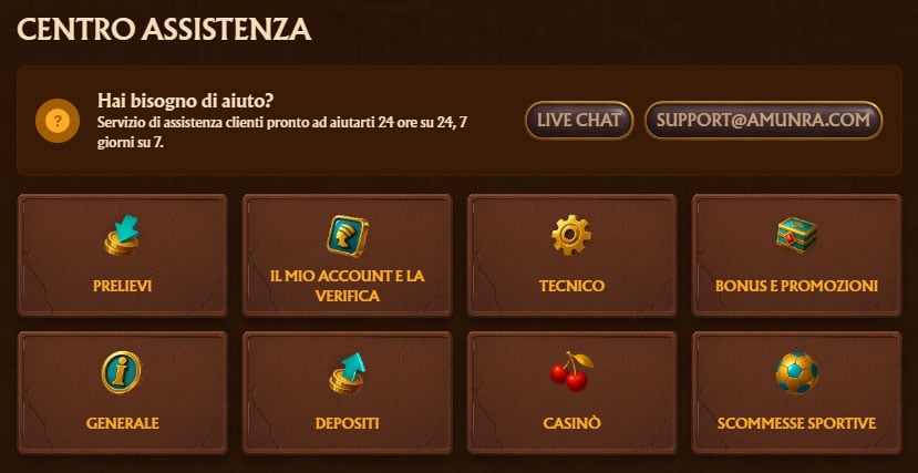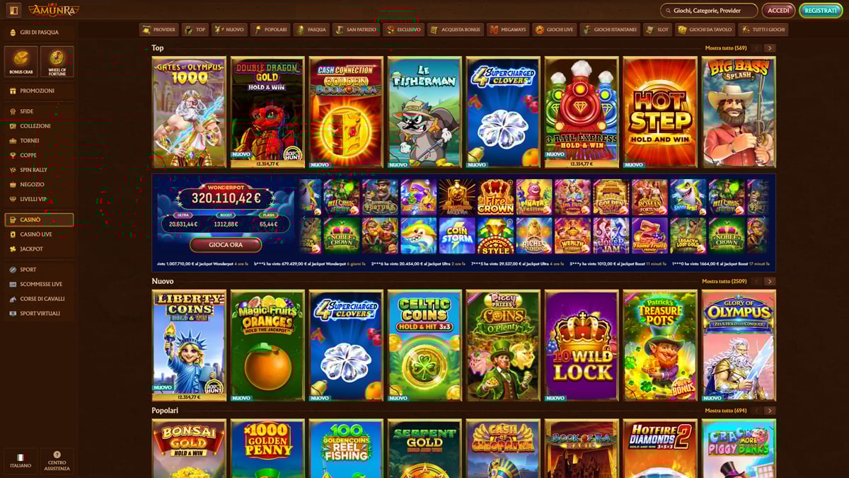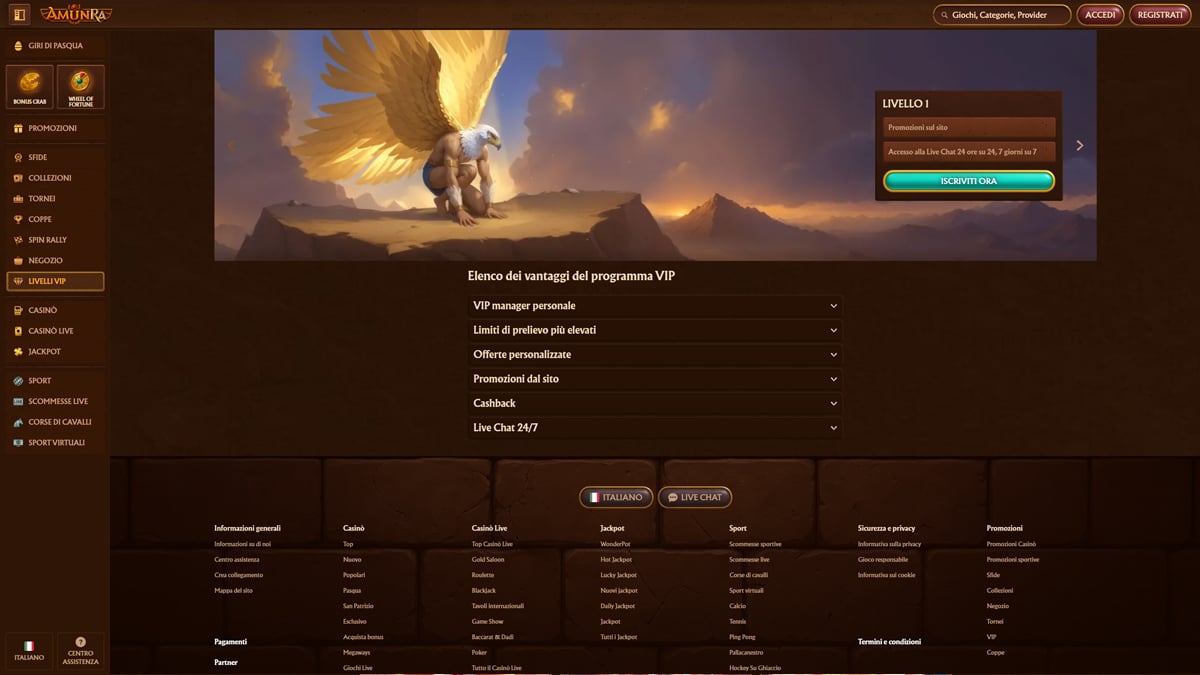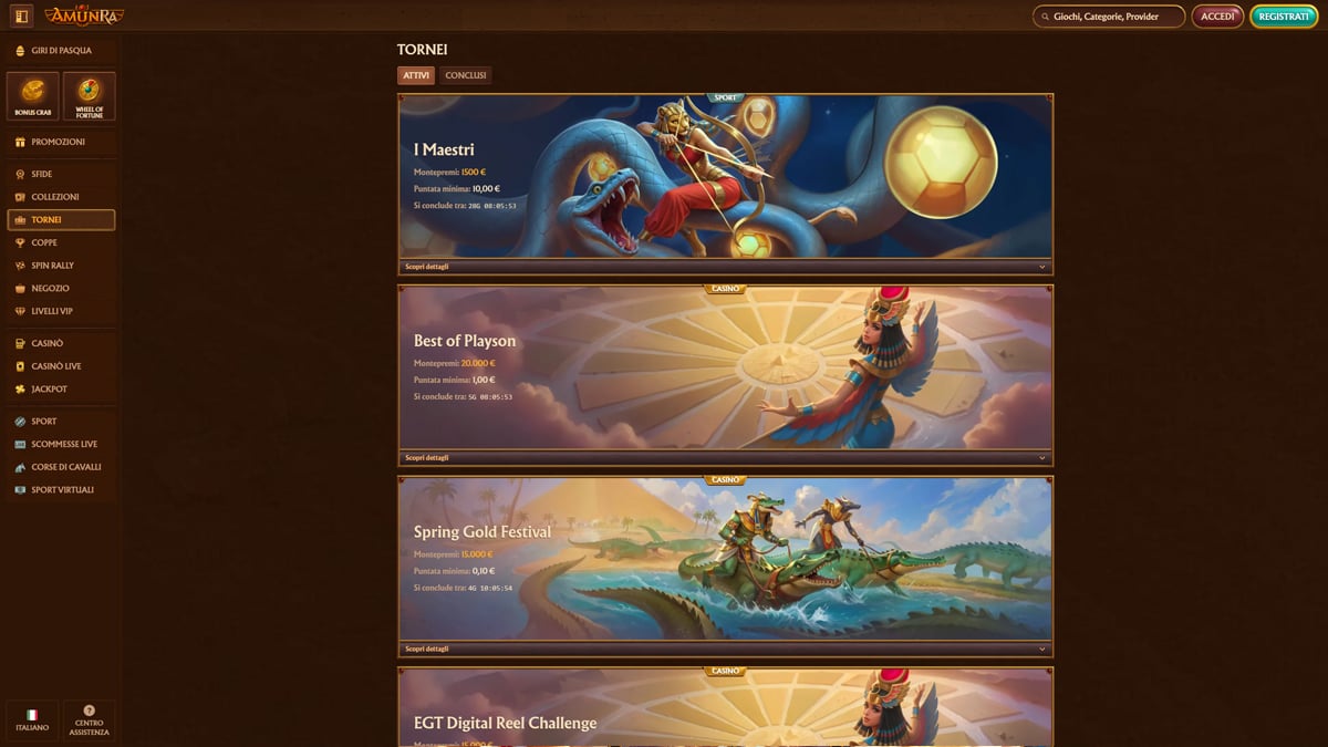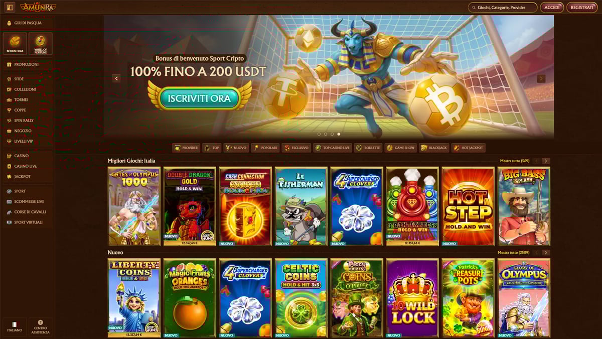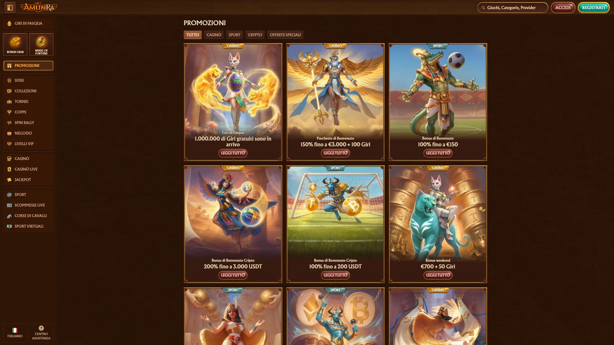AmunRa Casino è una piattaforma di gioco internazionale che unisce un'esperienza da casinò completa con scommesse sportive e un tema coinvolgente ispirato all'antico Egitto. Lanciato con l'obiettivo di fornire un gioco sicuro, divertente e incentrato sul giocatore, il sito offre un'ampia gamma di giochi, dalle slot ai tavoli con croupier dal vivo, e una serie di promozioni pensate per attrarre sia nuovi utenti che giocatori abituali.