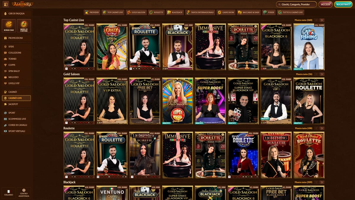 Casinò live Casinò live Giochi da casino in tempo reale trasmessi in streaming da studi professionali o casino fisici, con croupier reali e giochi da tavolo interattivi come roulette, blackjack e baccarat.