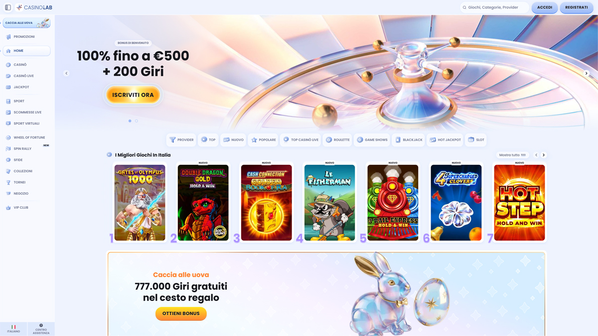 CasinoLab Casino dispone di una vastissima selezione pensata per soddisfare ogni tipo di giocatore. Gli utenti italiani hanno accesso a oltre 10.000 slot (dai classici ai video slot più moderni) e a più di 300 giochi live con croupier reali, tra roulette, blackjack, baccarat e show game. La combinazione è ideale sia per chi gioca occasionalmente sia per chi cerca sessioni lunghe ai tavoli live.