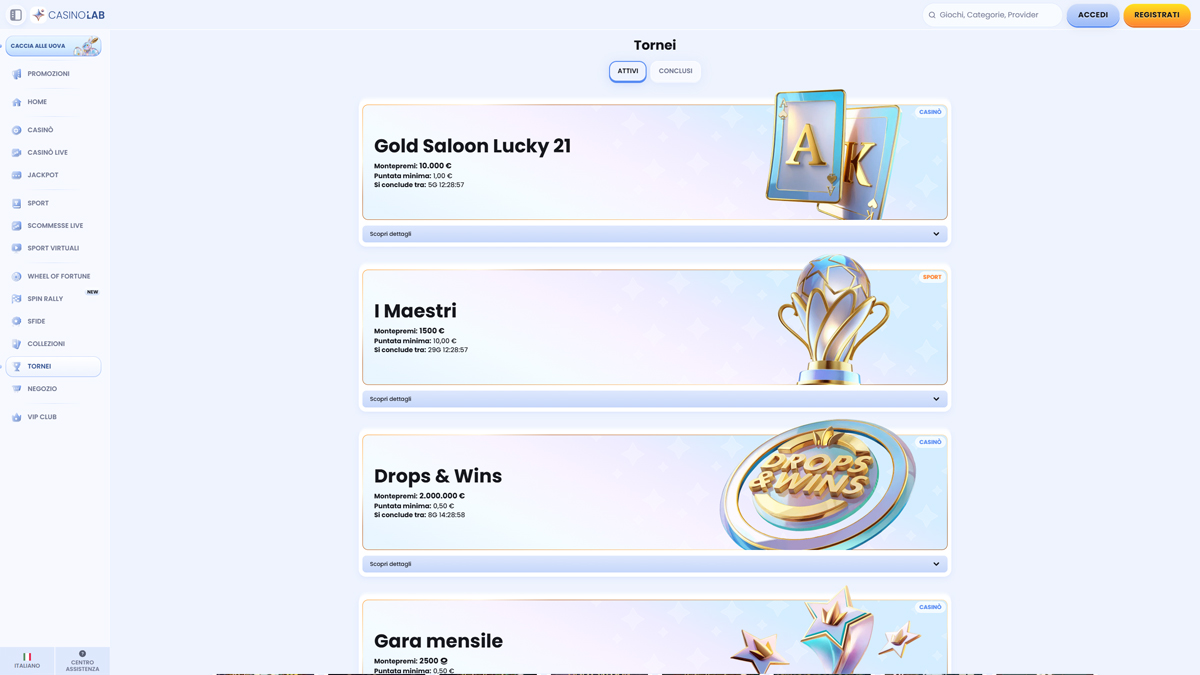 CasinoLab Casino mi convince per un motivo molto semplice: è una piattaforma completa, non solo un sito di slot che cerca di sembrare più grande di quello che è. Il sistema iGate funziona alla perfezione, la quantità di giochi è impressionante e la sezione live è abbastanza ricca da tenere incollati i giocatori italiani per mesi. Il deposito e prelievo minimi di 10 € lo rendono ideale anche per chi vuole provare senza rischiare troppo, mentre il supporto alle criptovalute dà quella flessibilità che tanti casinò tradizionali non offrono ancora. L’unica vera nota negativa è il limite di prelievo mensile di 7.000€ per i giocatori normali. Se giochi occasionalmente non lo noterai neanche; se invece punti più alto o centri una vincita importante, ti conviene capire subito come funziona il programma VIP e considerarlo parte integrante del valore complessivo del casinò.