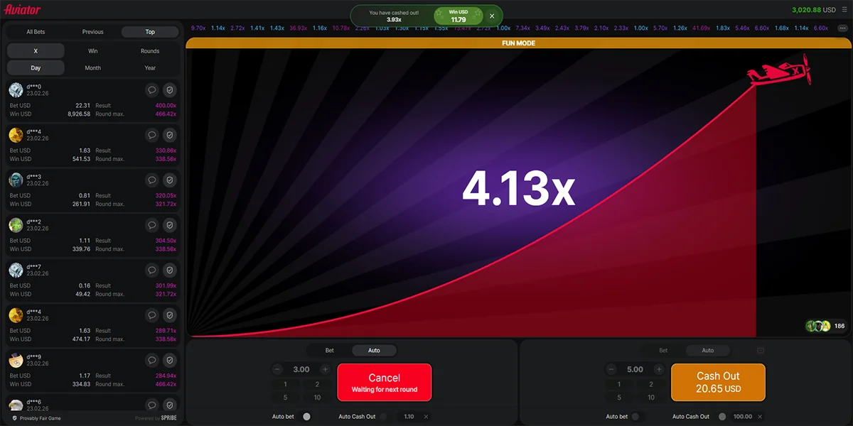Aviator si basa sul formato rapido Crash/Burst, dove ogni round inizia automaticamente ogni cinque secondi, mantenendo un'azione continua e coinvolgente. I giocatori possono piazzare fino a due scommesse per round e persino osservare i risultati degli altri partecipanti, aggiungendo una dimensione sociale e strategica all'esperienza. Le vincite sono determinate dal coefficiente crescente che aumenta mentre l'aereo sale, e le puntate possono essere chiuse in qualsiasi momento prima del crash. Per una maggiore comodità, è disponibile l'opzione di gioco automatico, che consente uno svolgimento del gioco più fluido e confortevole.