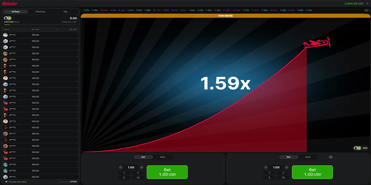 Aviator si differenzia dai classici titoli di slot adottando un formato Crash in rapida evoluzione che offre esperienze energiche basate sul tempismo e sul coraggio. All'inizio di ogni round, appare un aereo pronto al decollo insieme a un pannello delle scommesse che consente ai giocatori di piazzare fino a due puntate di valore compreso tra 0,1 e 100. I round si avviano automaticamente con una finestra di cinque secondi per modificare le puntate e pianificare l'approccio. Una caratteristica notevole è il chiaro display dei risultati degli altri partecipanti, che offre una visione che può aiutare a prendere decisioni più intelligenti man mano che l'azione si svolge.
