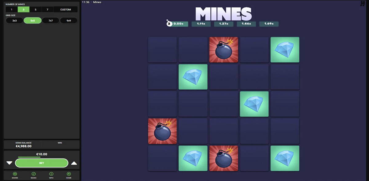 Dopo aver impostato la griglia, il gameplay consiste nello scoprire caselle nascoste. Cliccando su una casella si rivela un Diamante, che aumenta le vincite correnti, o una Bomba, che termina immediatamente il round e causa la perdita della puntata. La tensione cresce con ogni scelta della casella, poiché ogni decisione comporta il rischio di colpire una bomba, rendendo una strategia attenta essenziale per il successo.