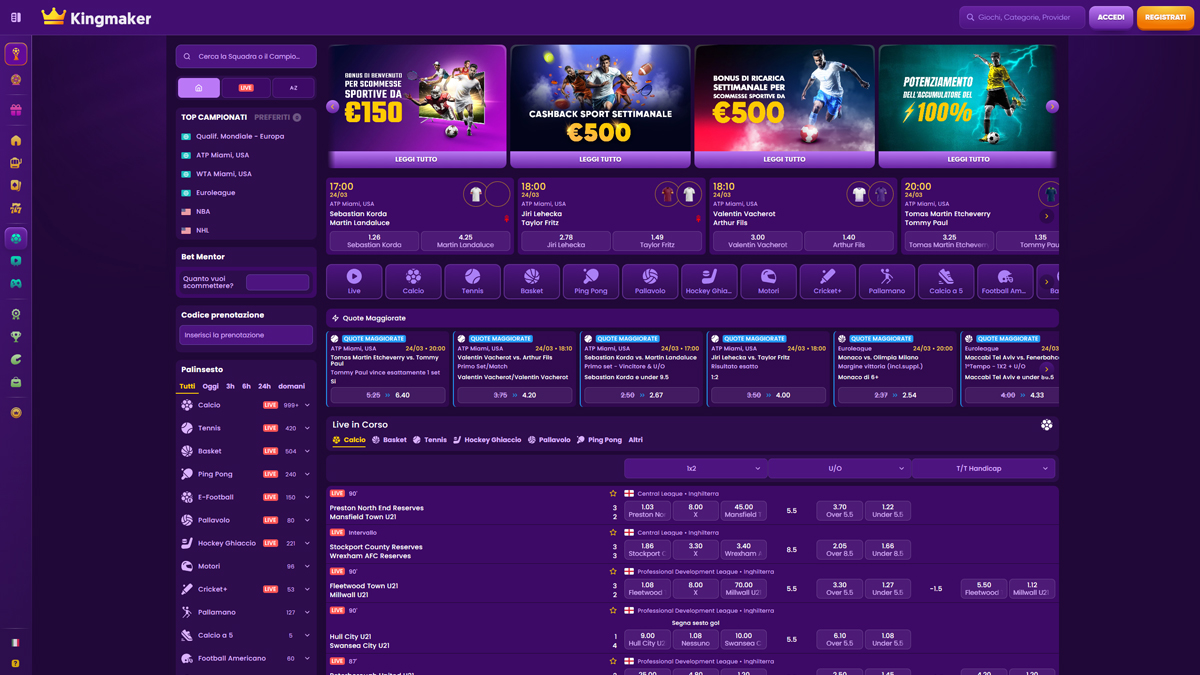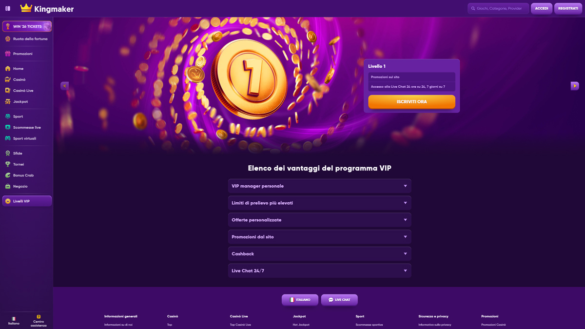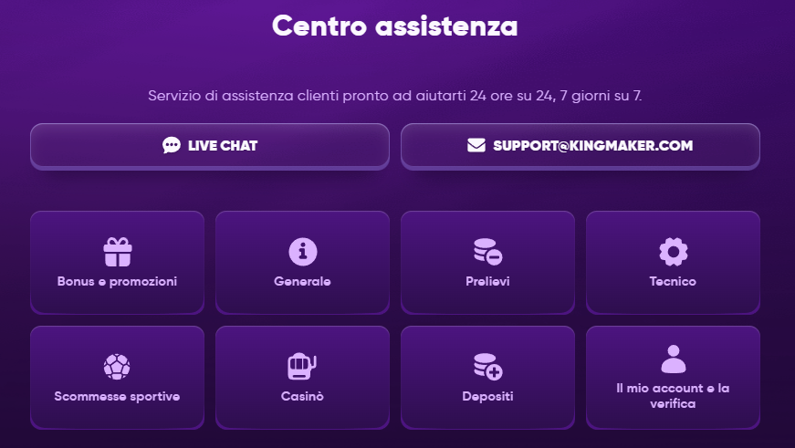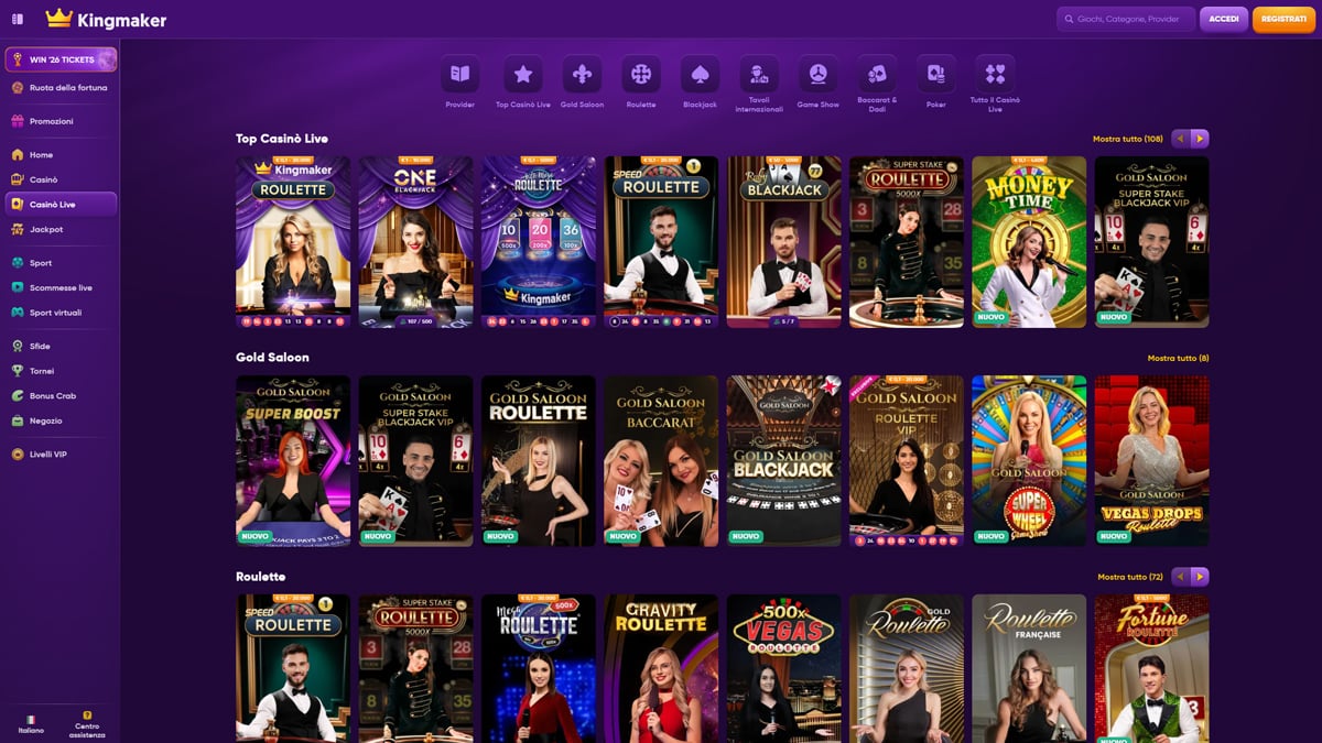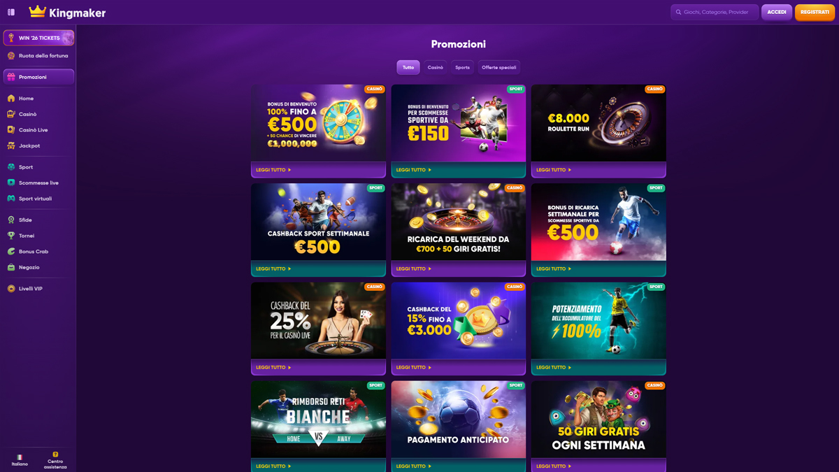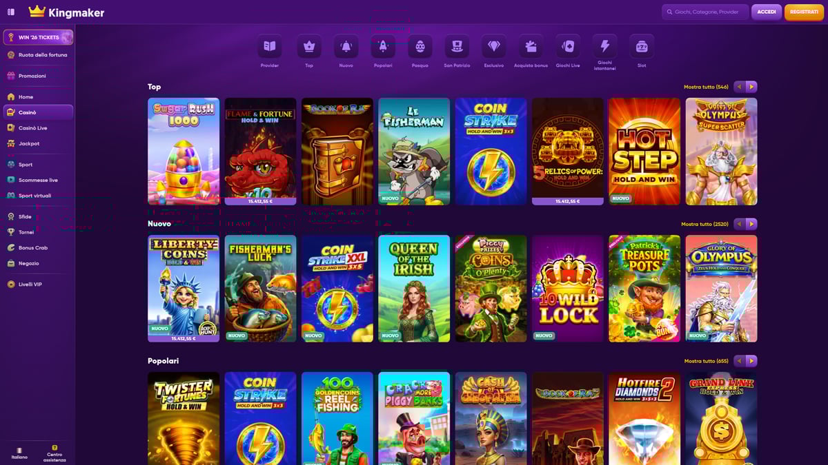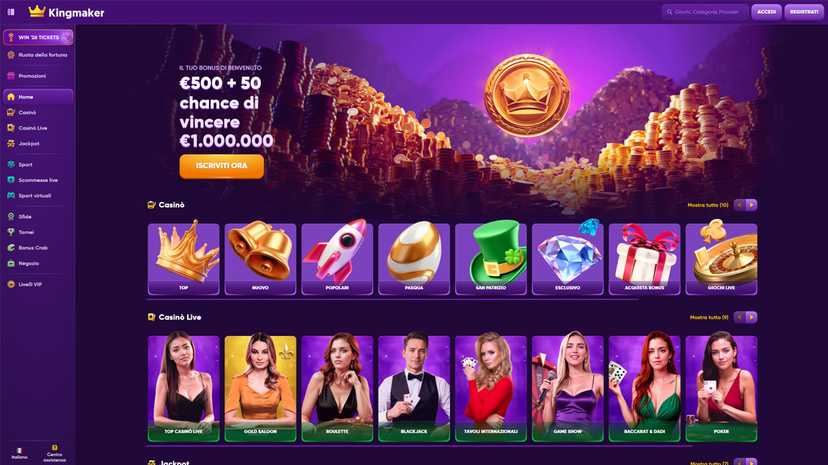 Kingmaker Casino è una piattaforma di gioco online progettata per attrarre i giocatori che apprezzano varietà, prestazioni e una struttura chiara. Il casinò offre un'ampia libreria di giochi che include migliaia di titoli da rinomati fornitori di software, coprendo slot, giochi da tavolo e una solida sezione di casinò live con croupier reali. La navigazione è intuitiva sia su computer che su dispositivi mobili, consentendo ai giocatori un rapido accesso ai giochi, alle promozioni e agli strumenti dell'account. La piattaforma supporta molteplici metodi di pagamento, inclusi opzioni tradizionali e criptovalute, rendendo depositi e prelievi flessibili per un'ampia gamma di utenti.
