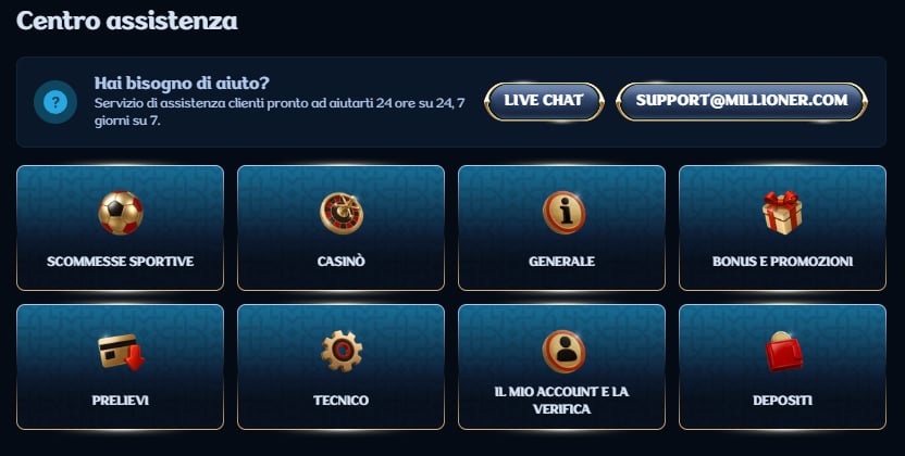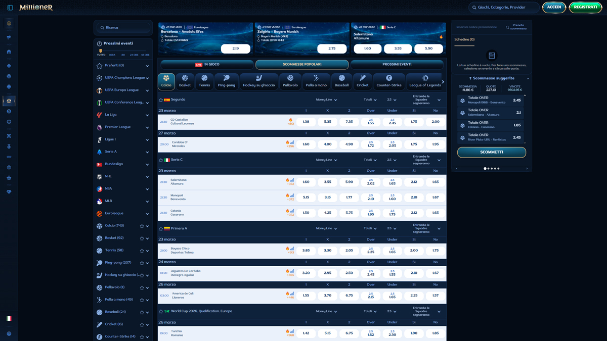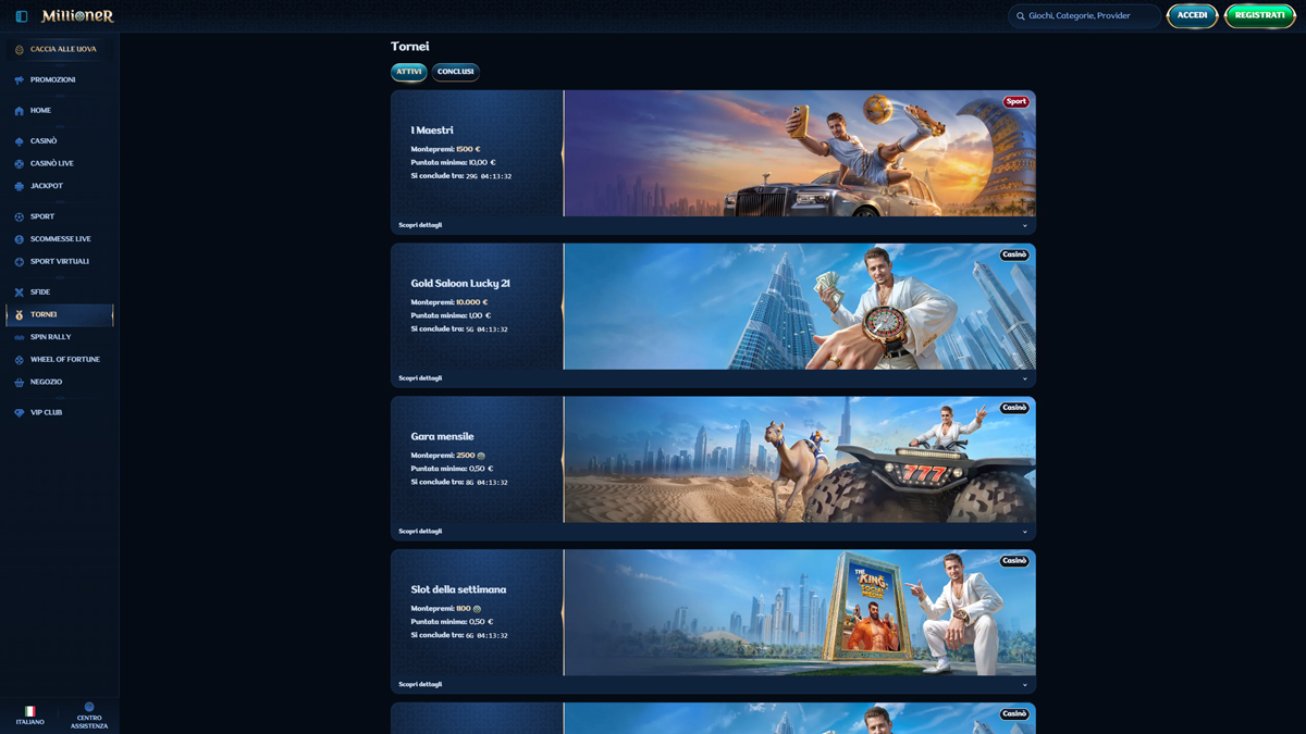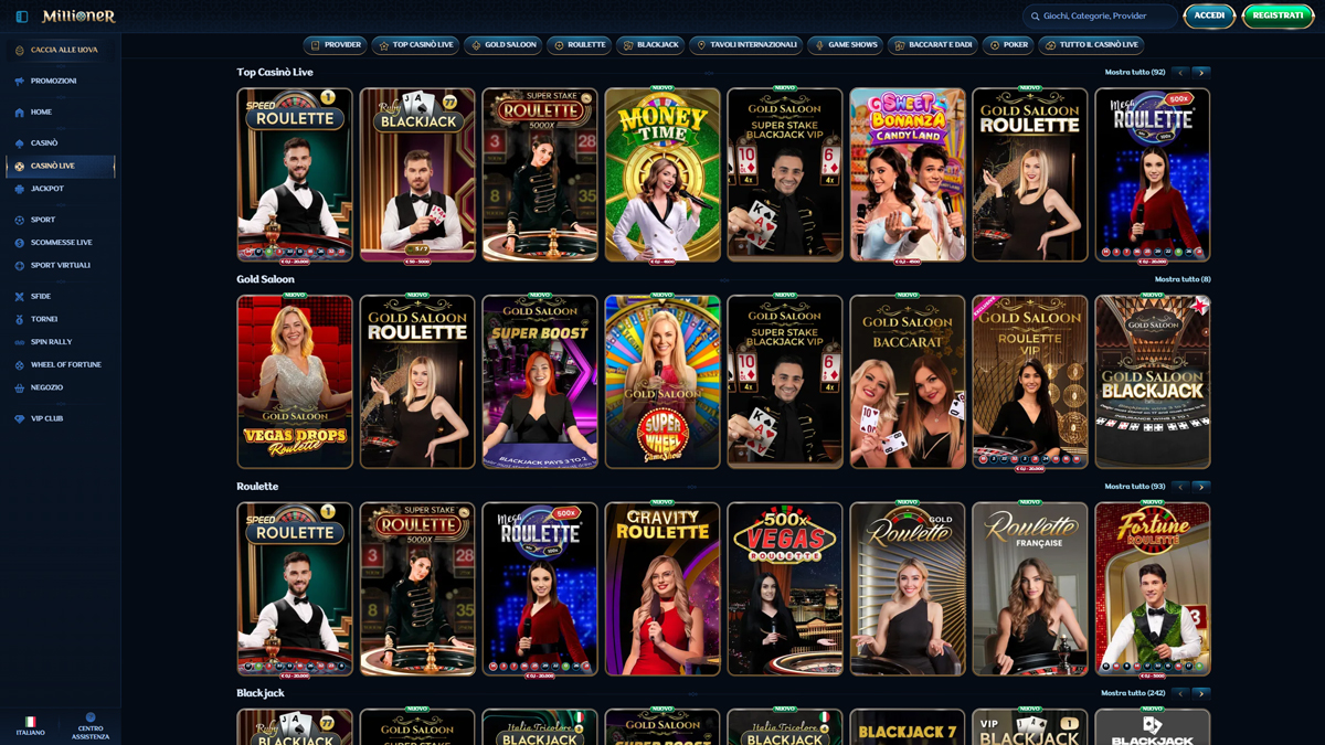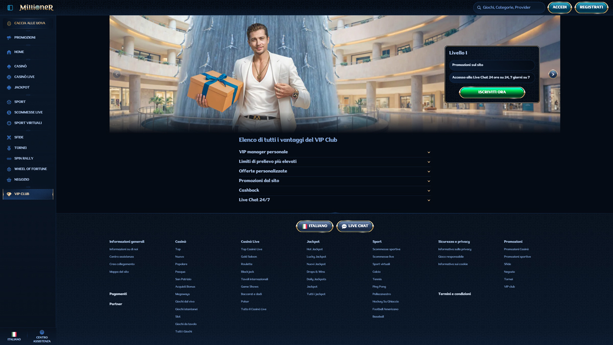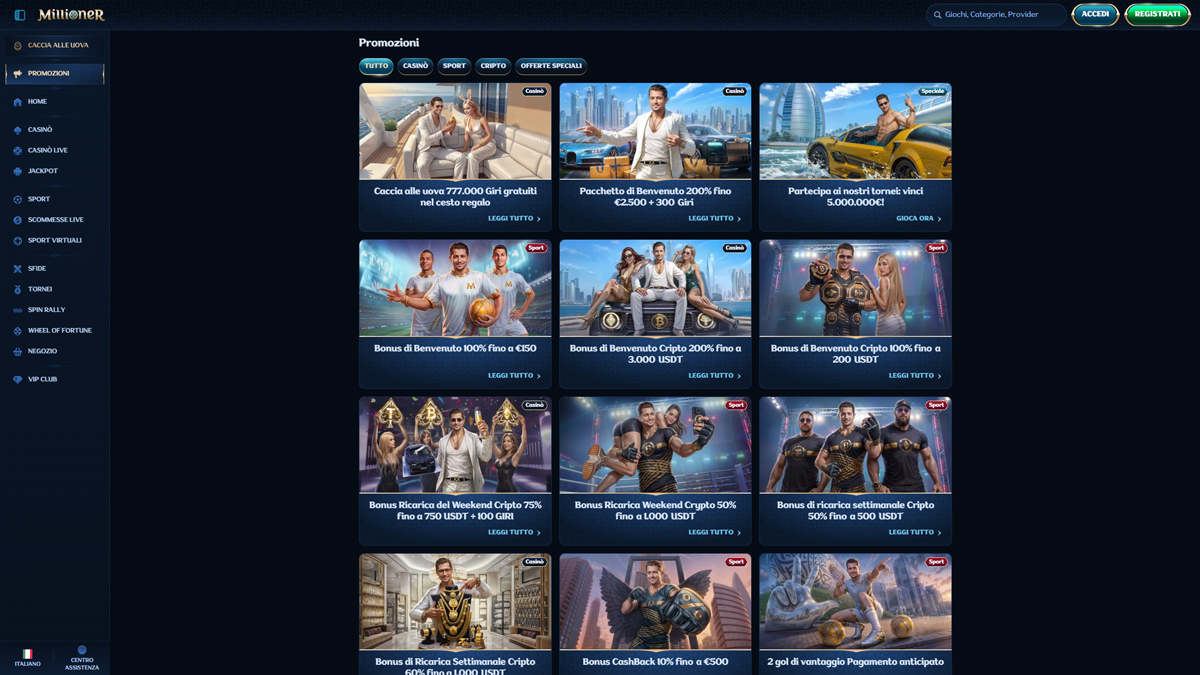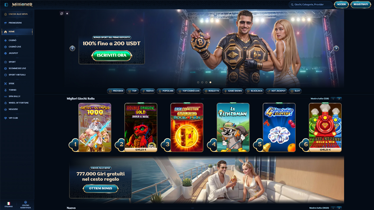 Millioner Casino è una piattaforma nuovissima (fondata nel 2025) che si presenta con un layout moderno e una gamma di prodotti sorprendentemente completa fin da subito. Il design è fresco e veloce, e la navigazione rimane pulita nonostante il casinò includa quasi tutto: un bookmaker completo, slot, casinò live, jackpot, corse, missioni, un sistema di shop e un programma VIP strutturato. La prima impressione più forte è la profondità. Non si tratta di un piccolo casinò di partenza. Con oltre 12.200 slot e più di 700 giochi live, Millioner punta chiaramente a un volume di contenuti elevato, supportato da una solida rete di provider tra cui Evolution, Pragmatic Play, Play'n GO, NetEnt, Nolimit City, Hacksaw e molti altri. Anche i pagamenti sembrano ben coperti per l'Italia, con carte standard, opzioni di bonifico bancario, Paysafecard, Revolut e molteplici criptovalute disponibili, oltre a un punto di partenza minimo di 10€ sia per i depositi che per i prelievi.