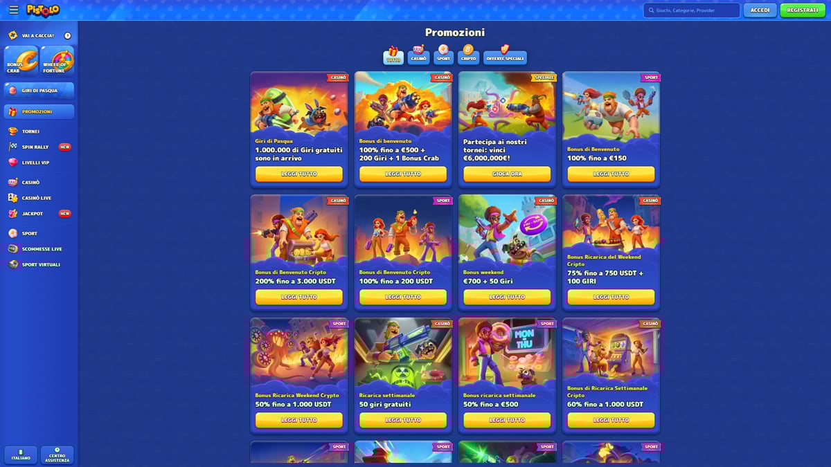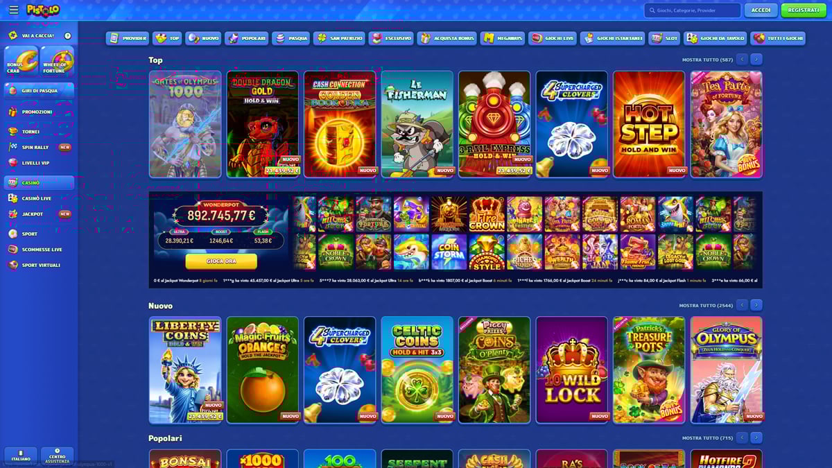 Dal punto di vista pratico, Pistolo pone grande enfasi sull’accessibilità e sulla varietà di giochi. La piattaforma vanta un catalogo esteso con focus principale sulle slot online da molteplici sviluppatori. Oltre alle slot, i giocatori italiani trovano tavoli classici come roulette, blackjack e baccarat, oltre a una sezione live casino con croupier professionisti in tempo reale.