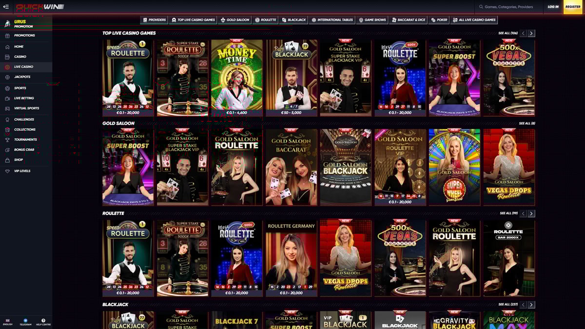 Casinò live Casinò live Giochi da casino in tempo reale trasmessi in streaming da studi professionali o casino fisici, con croupier reali e giochi da tavolo interattivi come roulette, blackjack e baccarat.