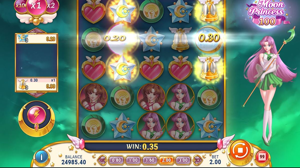 Moon Princess 100 utilizza il sistema delle vincite a grappolo su una disposizione 5×5, eliminando completamente le linee di pagamento fisse. Le vincite si verificano quando grappoli di simboli identici si uniscono orizzontalmente o verticalmente in gruppi di almeno tre. Quando si forma una combinazione vincente, i simboli scompaiono e nuovi cadono dall'alto per riempire gli spazi vuoti, creando una cascata che può generare ulteriori vincite nello stesso giro.