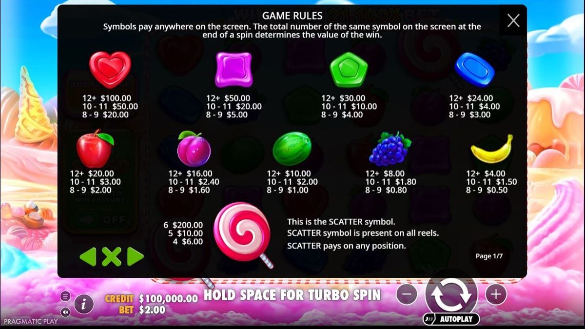 Con una vincita massima di oltre 2,1 milioni di euro, Sweet Bonanza è matematicamente costruita sulla pazienza, non su brevi eruzioni. Non ci sono scommesse laterali, linee di pagamento da impostare o funzioni rischio, il che mantiene il gameplay pulito e accessibile una volta compreso il sistema a grappoli.