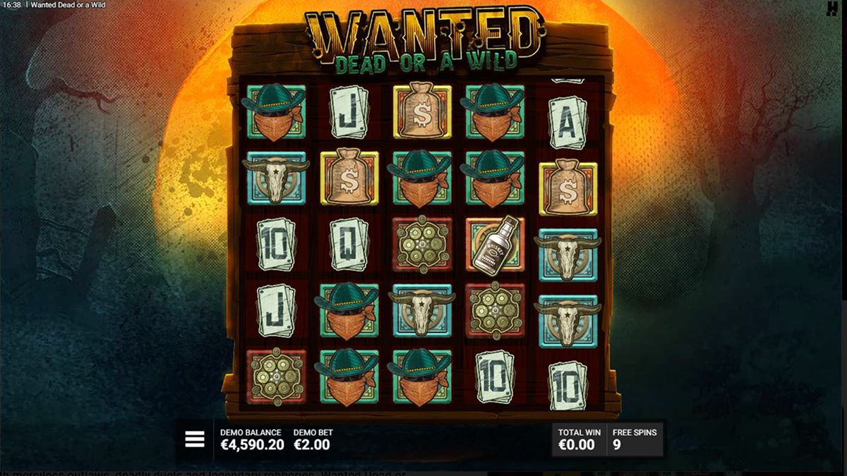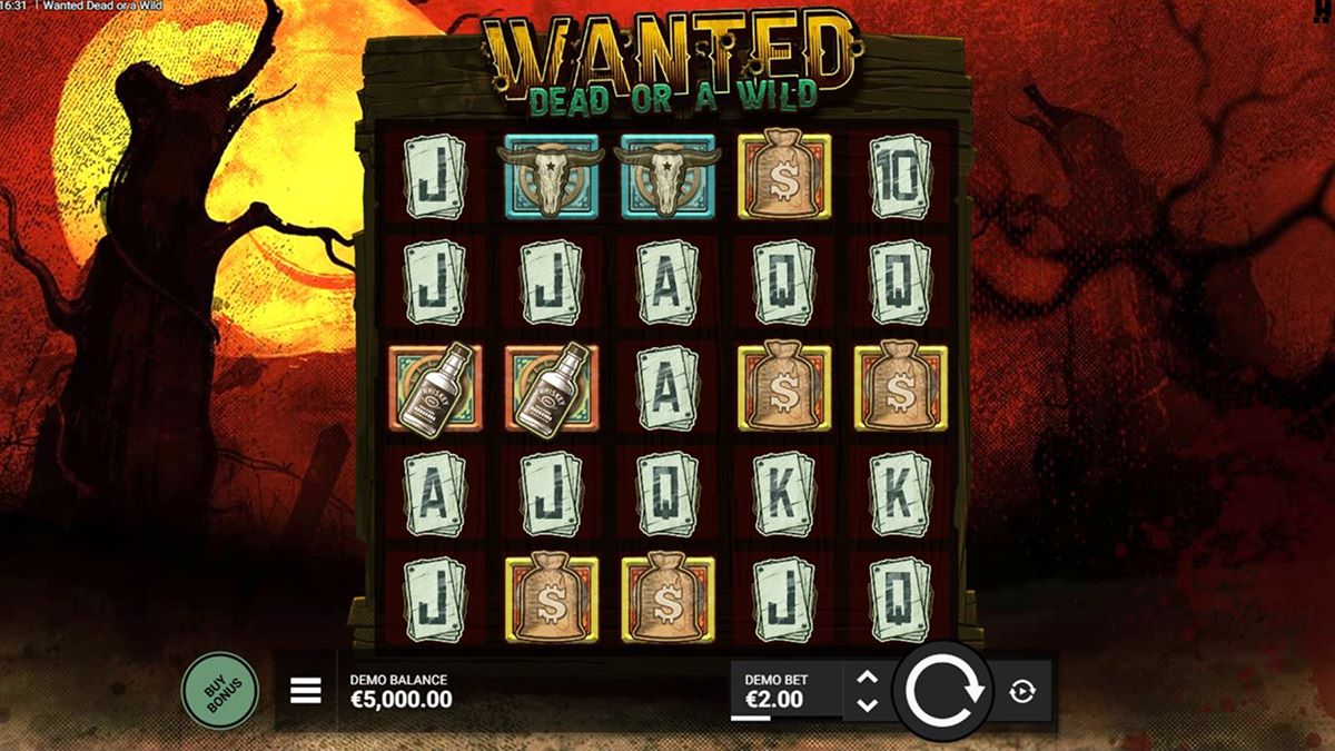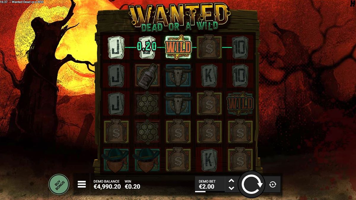 Il gioco utilizza una disposizione tradizionale 5×5 con 15 linee di pagamento, dove le vincite sono formate da combinazioni di simboli da sinistra a destra. A differenza di molte slot moderne che si affidano a un feedback costante nel gioco base, Wanted Dead or a Wild ha un gioco base volutamente attenuato. Le vincite si verificano meno frequentemente, riflettendo la sua frequenza di colpo del 19,36%, ma questa intenzione progettuale aumenta l'impatto dell'attivazione delle funzioni.