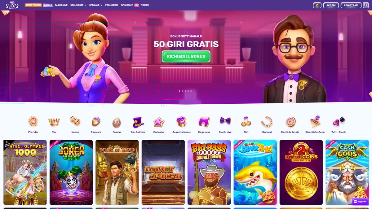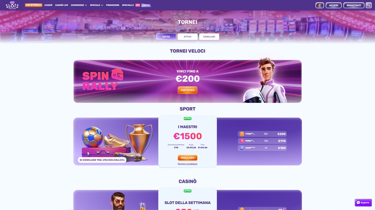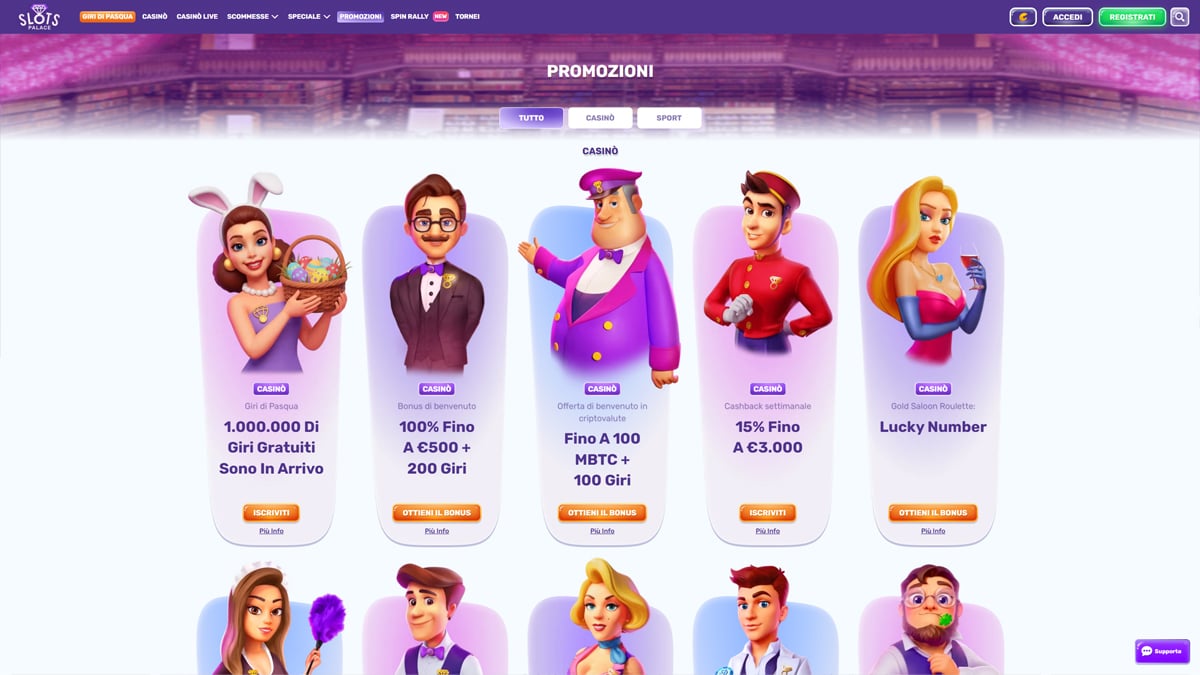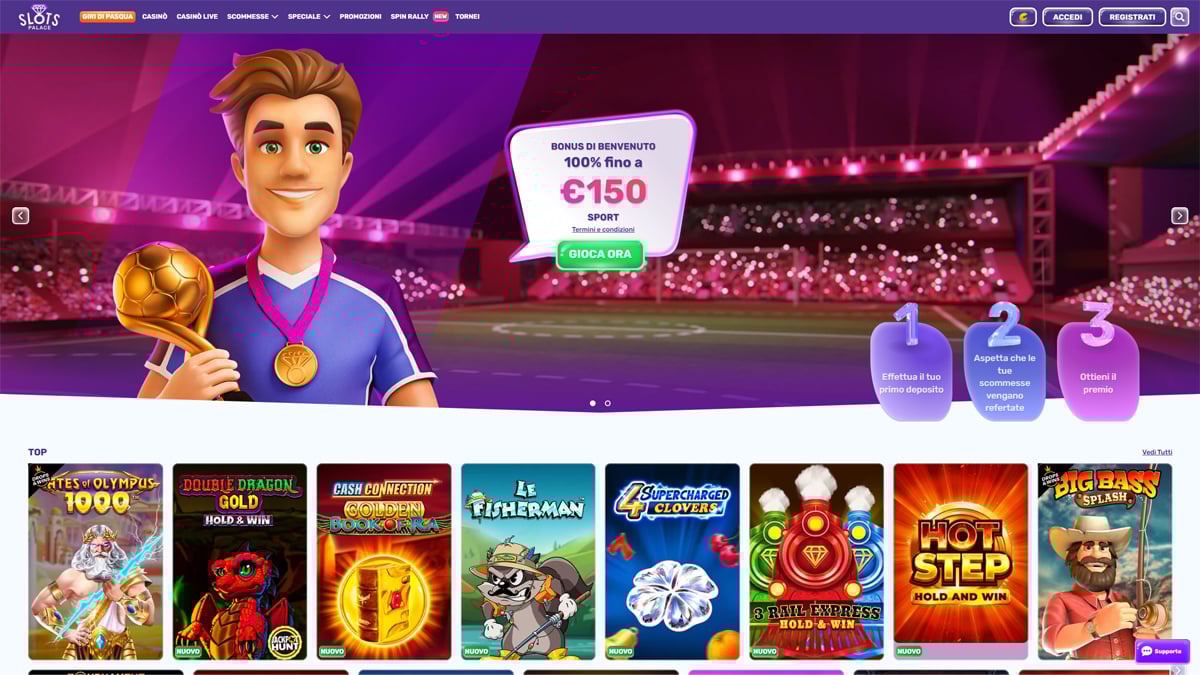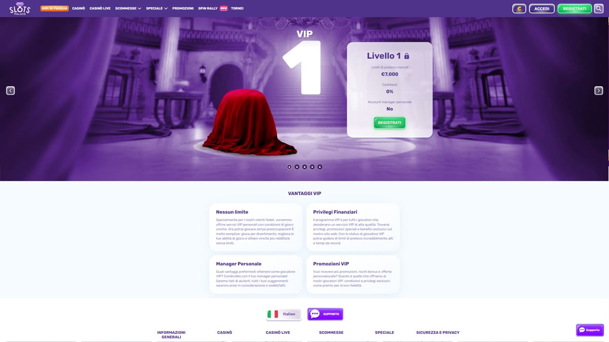 SlotsPalace Casino è una piattaforma di gioco ad alta capacità costruita sulla scala e la varietà, che combina un enorme catalogo di slot con una solida sezione di casinò live e un bookmaker completo sotto un unico account. Il layout del sito è moderno e basato su categorie, rendendo la navigazione tra migliaia di titoli gestibile. Oltre ai giochi da casinò, SlotsPalace promuove le scommesse sportive come prodotto chiave con un proprio bonus di benvenuto e accesso a scommesse live, corse e sport virtuali, il tutto visibile direttamente dal menu principale. L'esperienza include anche promozioni, tornei e classifiche competitive, mantenendo la piattaforma attiva anche quando non si cerca un singolo bonus. Con un deposito minimo di 10 EUR e un prelievo minimo di 10 EUR, è accessibile ai giocatori occasionali, mentre il limite di prelievo mensile per i giocatori non VIP è di 7.000€, stabilendo un tetto chiaro per i giocatori abituali.