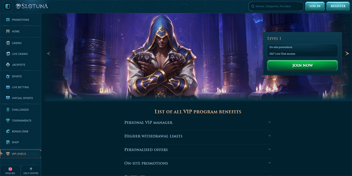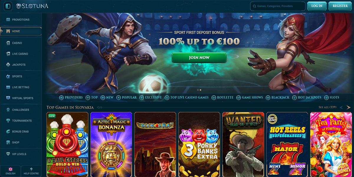 Slotuna Casino, lanciato nel 2024, si presenta come una moderna piattaforma di casinò e scommesse online progettata con un focus sulla semplicità e la giocabilità. La piattaforma combina una vasta offerta di casinò – che include slot, giochi da tavolo, titoli con croupier dal vivo e jackpot – con una sezione di bookmaker integrata che comprende mercati sportivi tradizionali, scommesse live e sport virtuali. Slotuna enfatizza un design pulito, una navigazione reattiva e un layout ricco di funzionalità che si adatta ai giocatori in cerca sia di intrattenimento al casinò che di scommesse sportive in un unico posto.