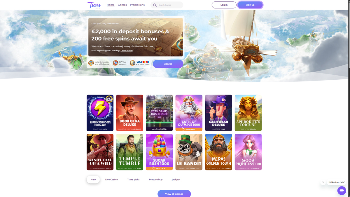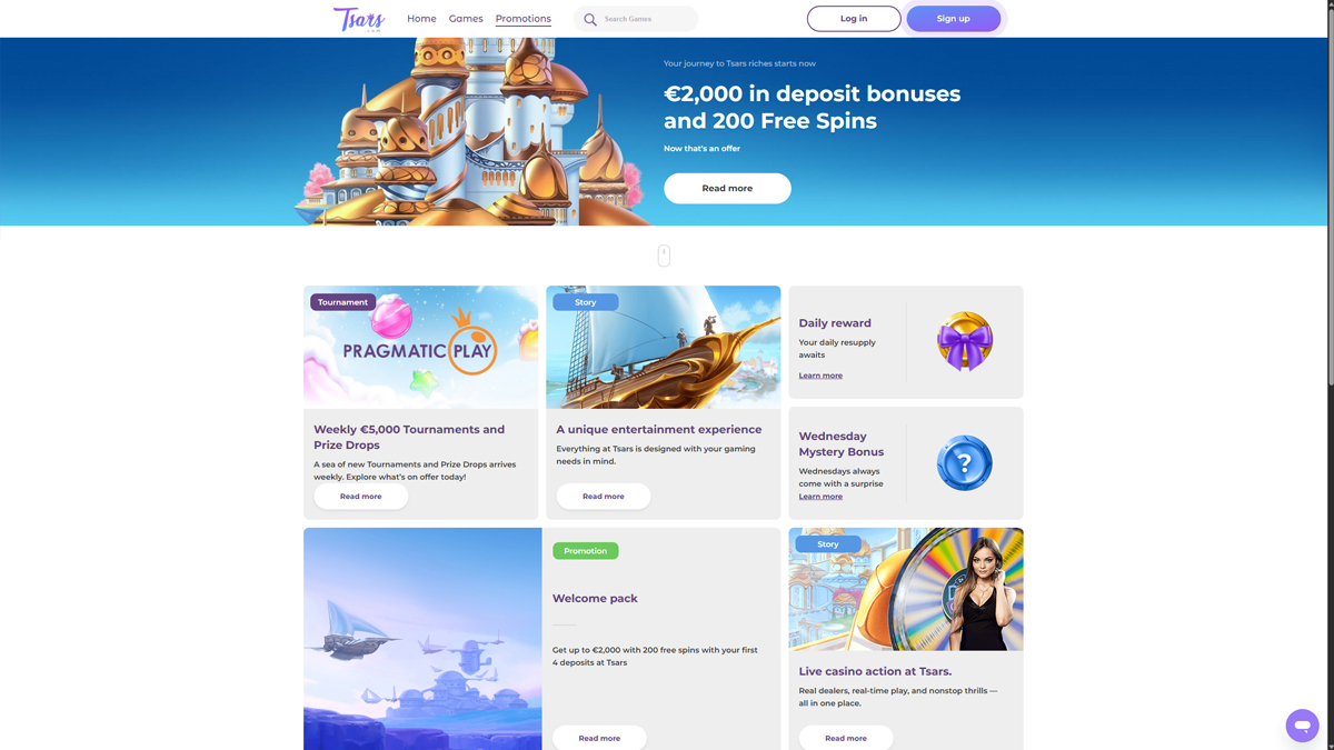 Tsars Casino è un casinò online che promuove in modo prominente sul suo sito ufficiale un bonus di benvenuto fino a 2.000€ + 200 Giri Gratis. La piattaforma ospita un'ampia selezione di giochi da casinò, inclusi slot e molti altri titoli, che i giocatori possono esplorare nell'elenco dei giochi. I termini e le condizioni pubblicati richiedono che gli utenti abbiano più di 18 anni e accettino le regole del casinò e le procedure KYC prima di giocare; questi termini coprono anche il processo di registrazione e verifica dell'account. I pagamenti e il gioco avvengono attraverso siti con enfasi sul gioco responsabile e chiari doveri per l'utente.