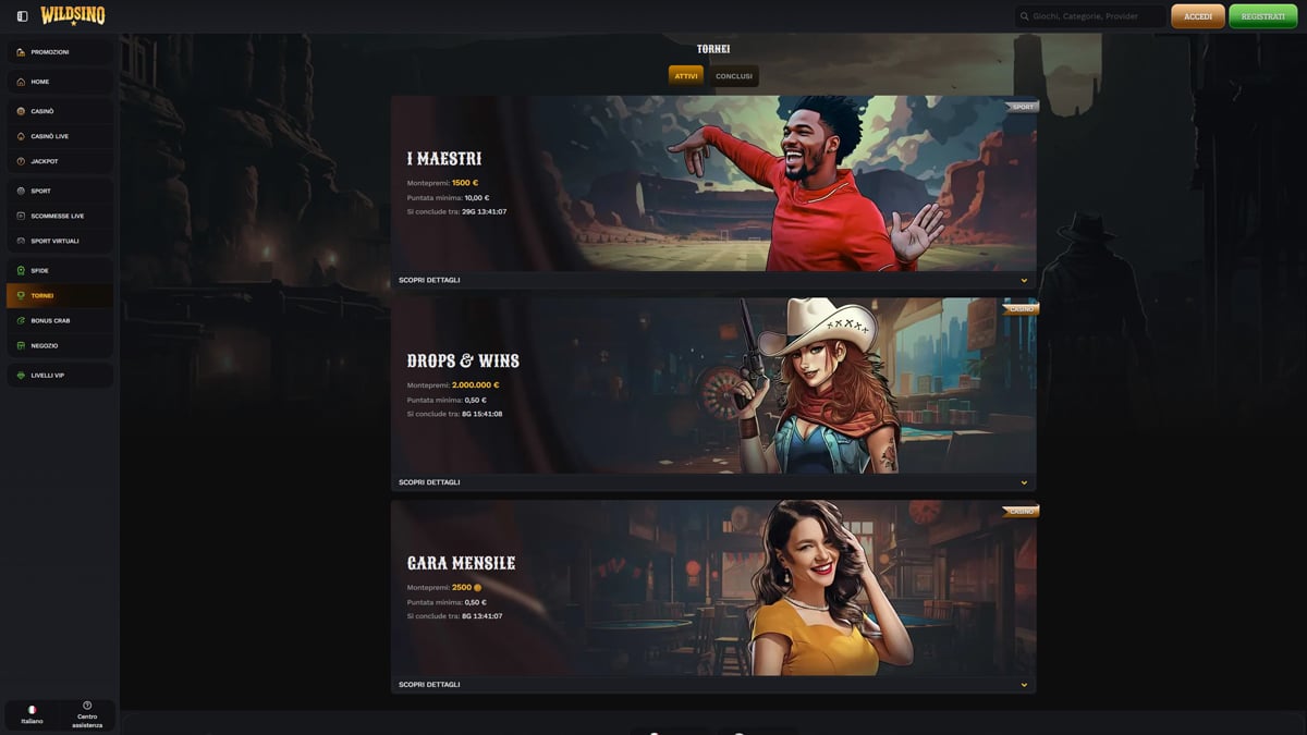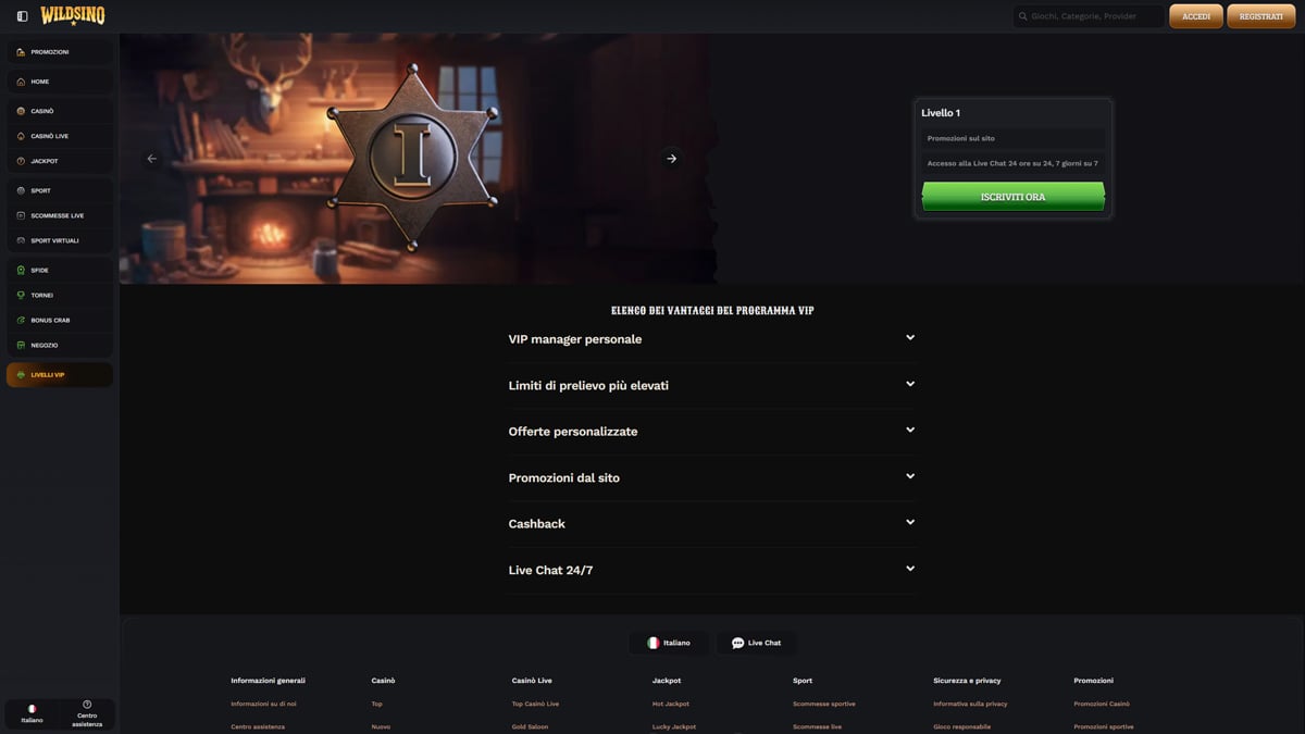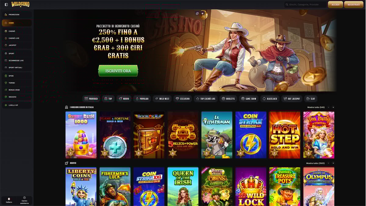 WildSino Casino è una destinazione di gioco online a tema West, apparsa sul mercato nel 2024 e opera con doppia licenza rilasciata dal Gaming Board of Anjouan e dal PAGCOR. Accoglie calorosamente i giocatori italiani. La piattaforma vanta un catalogo esteso con oltre 10.000 titoli da casinò, inclusi video slot, jackpot progressivi, giochi da tavolo e un'immersiva sezione di casinò live. È presente anche una sportsbook completa che copre calcio, basket, tennis ed eSport. I giocatori italiani possono usufruire di soglie di ingresso accessibili con depositi minimi a partire da 20 € per la maggior parte dei metodi, soluzioni di pagamento diversificate che includono banche tradizionali e criptovalute, e un'esperienza mobile direttamente dal browser, che offre la funzionalità completa del casinò senza bisogno di installare un'app. Tutto ciò rende WildSino una destinazione attraente per gli italiani alla ricerca di una piattaforma di gioco online ricca di funzionalità.