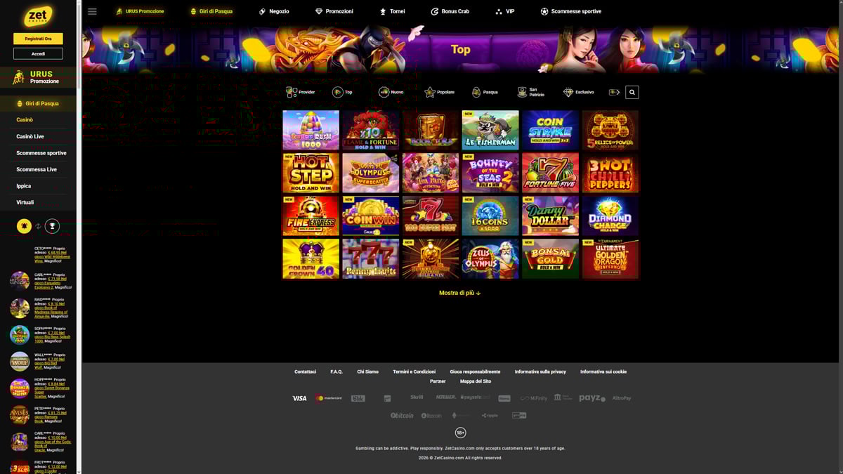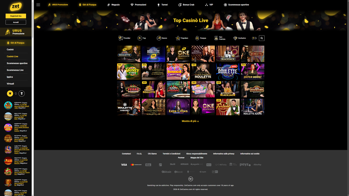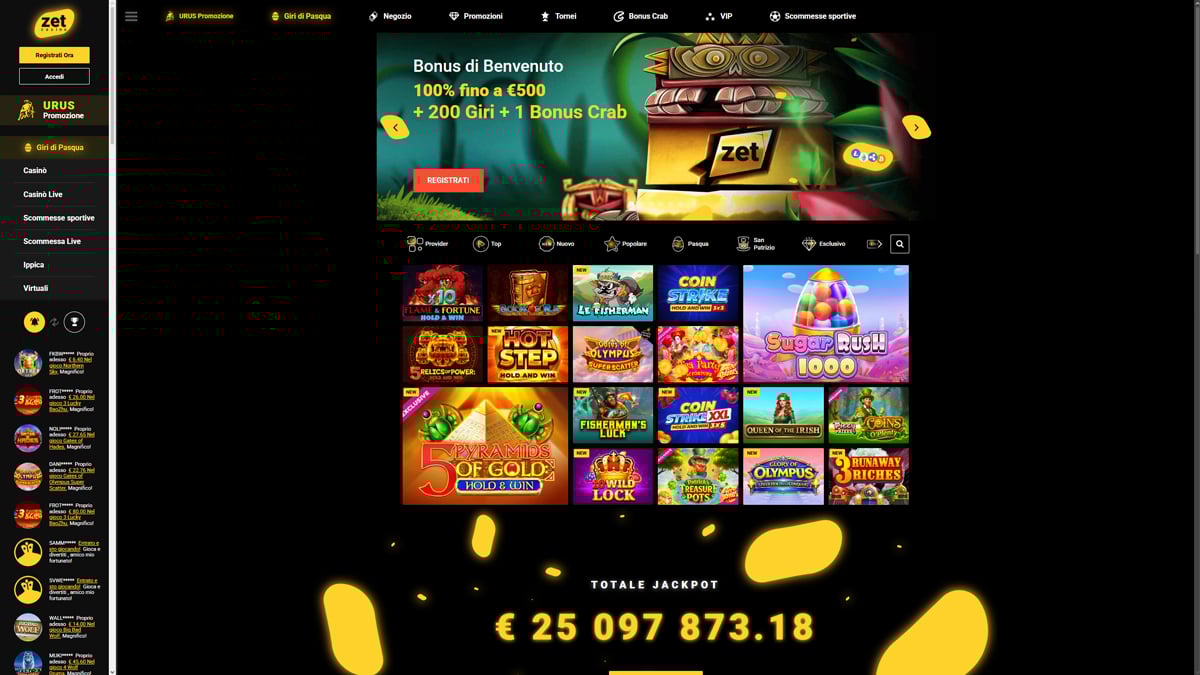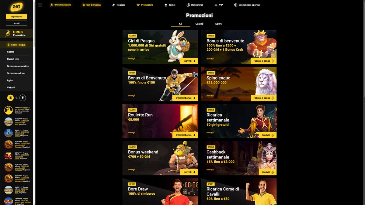 Zet Casino si presenta come un casinò online con un'enorme selezione di giochi, costruito per i giocatori che apprezzano la varietà, la struttura chiara e l'accesso tramite browser. La piattaforma combina giochi da casinò e scommesse sportive in un unico account, con una navigazione semplice e coerente in tutte le sezioni. Con oltre 9.400 giochi slot e più di 260 titoli nella sezione live casino e giochi da tavolo, l'enfasi principale è sulla varietà piuttosto che su funzionalità specializzate.