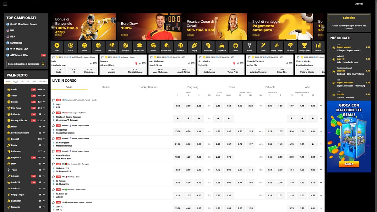 Scommesse sportive Scommesse sportive Indica i casino che includono una sezione di scommesse sportive integrata con quote in tempo reale e mercati per eventi sportivi ed esportivi.